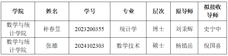 根据《东北师范大学研究生转学、转专业、转导师管理细则》(东师校发字[2022]213号)相关规定,经本人申请—原指导教师、拟接收导师及培养单位同意—研究生院审核,拟批准朴春昱等2名研究生转导师,现予公示。