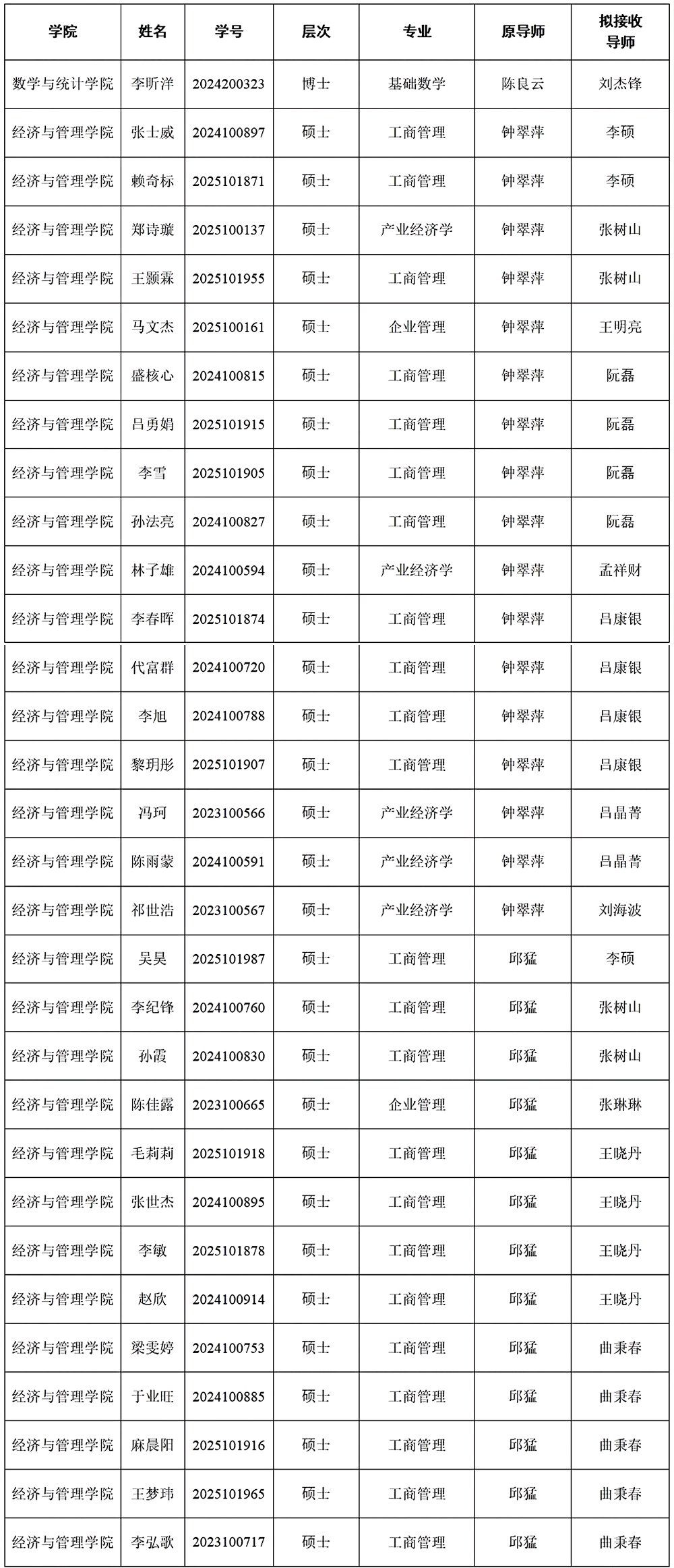 根据《东北师范大学研究生转学、转专业、转导师管理细则》(东师校发字[2022]213号)相关规定,经由原指导教师、拟接收指导教师、培养单位同意,研究生院审核,批准李昕洋等31名研究生转导师申请。相关研究生信息如下: