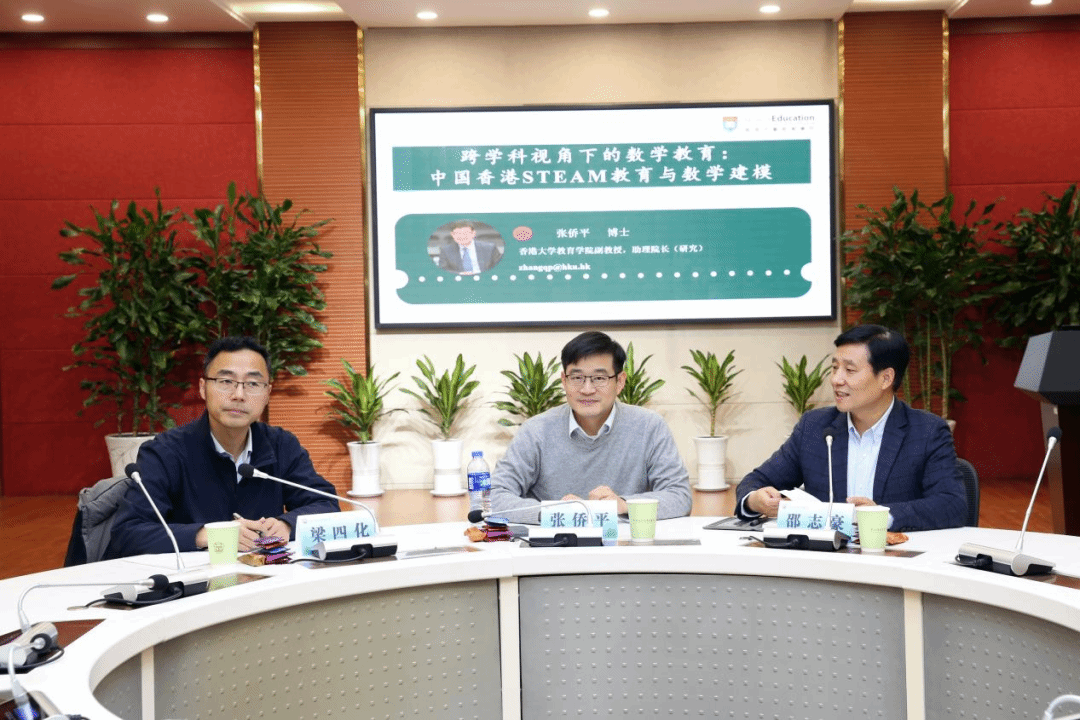 本次论坛以“跨学科视角下的数学教育:中国香港的STEAM教育和数学建模”为主题,特邀香港大学教育学院副教授、助理院长(研究)、博士生导师张侨平作专题报告。长春师范学院数学学院院长、博士生导师梁四化,东北师大校长助理、东北师大附中校长、博士生导师邵志豪共同出席本次活动。东北师范大学教育学部课程与教学论方向的博士生、教育博士,东北师大合作学校的数学老师以及东北师大附中的初高中数学教师共同参与了本次学术活动。